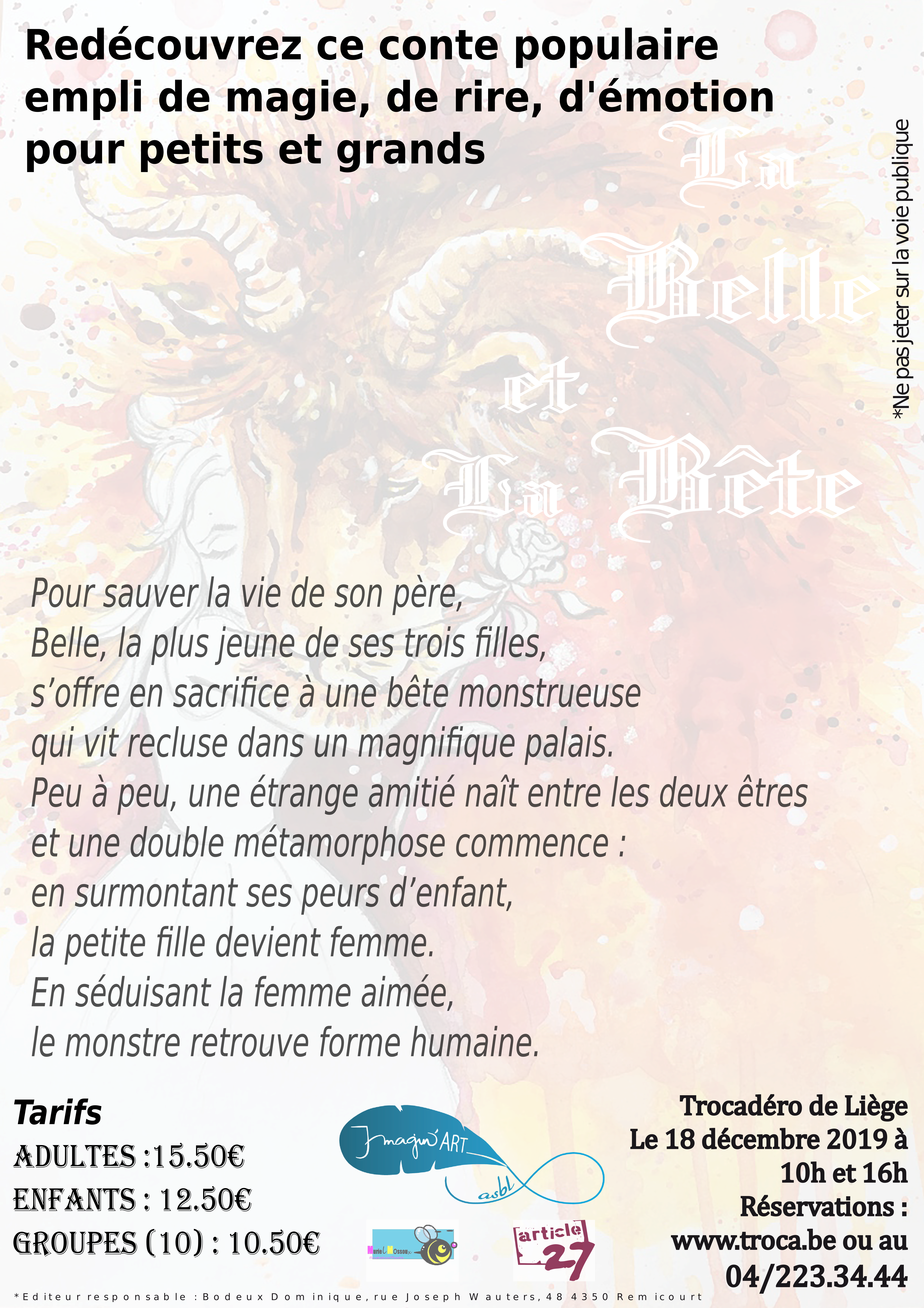 - « La Belle et la Bête », nouveau spectacle destiné à tous sera joué pour 3 représentations au Centre culturel de Jupille ces 3 mars à 10h30 et 14h30 en scolaire et le 4 mars à 10h en scolaire.